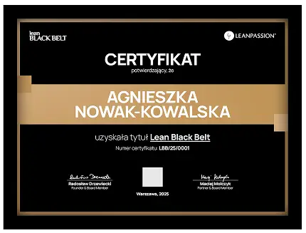 Lean BLACK BELT® to certyfikowany program rozwojowy dedykowany kadrze menedżerskiej i jedyny w Polsce program rozwoju kompetencji Lean w ujęciu strategicznym, a nie tylko narzędziowym. Przeznaczony jest dla osób, które chcą nauczyć się Lean w praktyce, tak by móc m.in: tworzyć misję, wizję, wartości oraz cele strategiczne by nadać sens istnienia oraz zbudować poczucie przynależności w organizacji, kaskadować cele strategiczne do poziomu celów wspólnych oraz indywidualnych KPI ‘s, budować system zarządzania wynikami pracy angażujący wszystkich pracowników w proces ciągłego doskonalenia. Uczestnicy będą musieli zaprezentować MY LEAN JOURNEY plan transformacji w kierunku Strategii Lean. W efekcie zdobędą praktyczne umiejętności zwiększania efektywności procesów skutecznie i szybciej od konkurencji. Ponad 52% menedżerów, którzy pomyślnie ukończyli programy rozwojowe realizowane przez Leanpassion awansuje lub przejmuję nowy zakres odpowiedzialności w swoich organizacjach w ciągu 12 miesięcy od zakończenia programu.