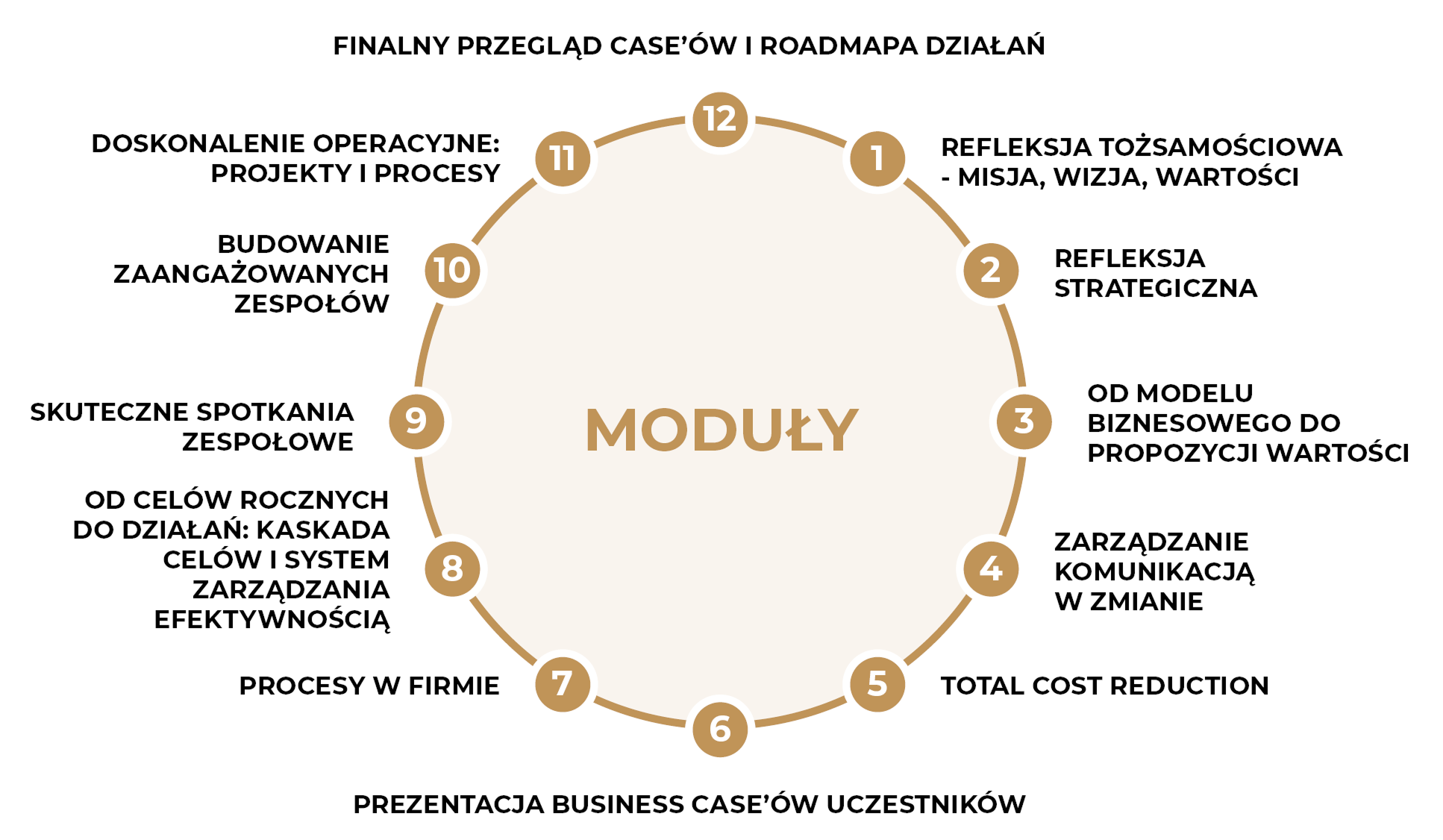 W tym module Istnieje możliwość wizyt referencyjnych u uczestników Programu – prezentacja na żywo własnego case study, skorzystanie z wiedzy i ekspertyzy trenera i uczestników w celu weryfikacji skuteczności dotychczasowych działań, uzyskania zewnętrznej perspektywy, by móc z sukcesem pokierować dalszą transformacją. Szczegóły zostaną omówione podczas Kick-offu, na początku Modułu I.